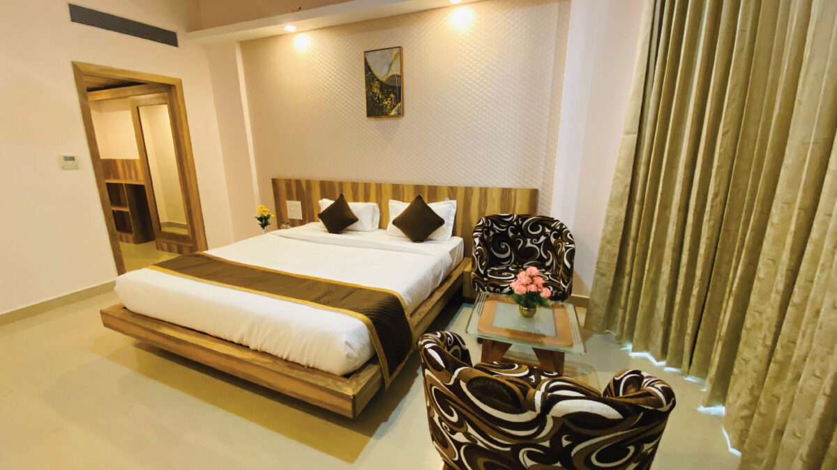 As the largest room in our property, the royale suite has been meticulously designed to offer a truly unique experience. Indulge in lavish furnishings and panoramic views of the lush green mountains. This opulent suite features spacious living areas with sofas and a bedroom with sofa chairs and king-size bed, complemented by two luxurious washrooms. Amenities include AC, Wi-Fi, TVs, a mini-bar, and an electronic safe, ensuring a rejuvenating luxury stay for our guests.
